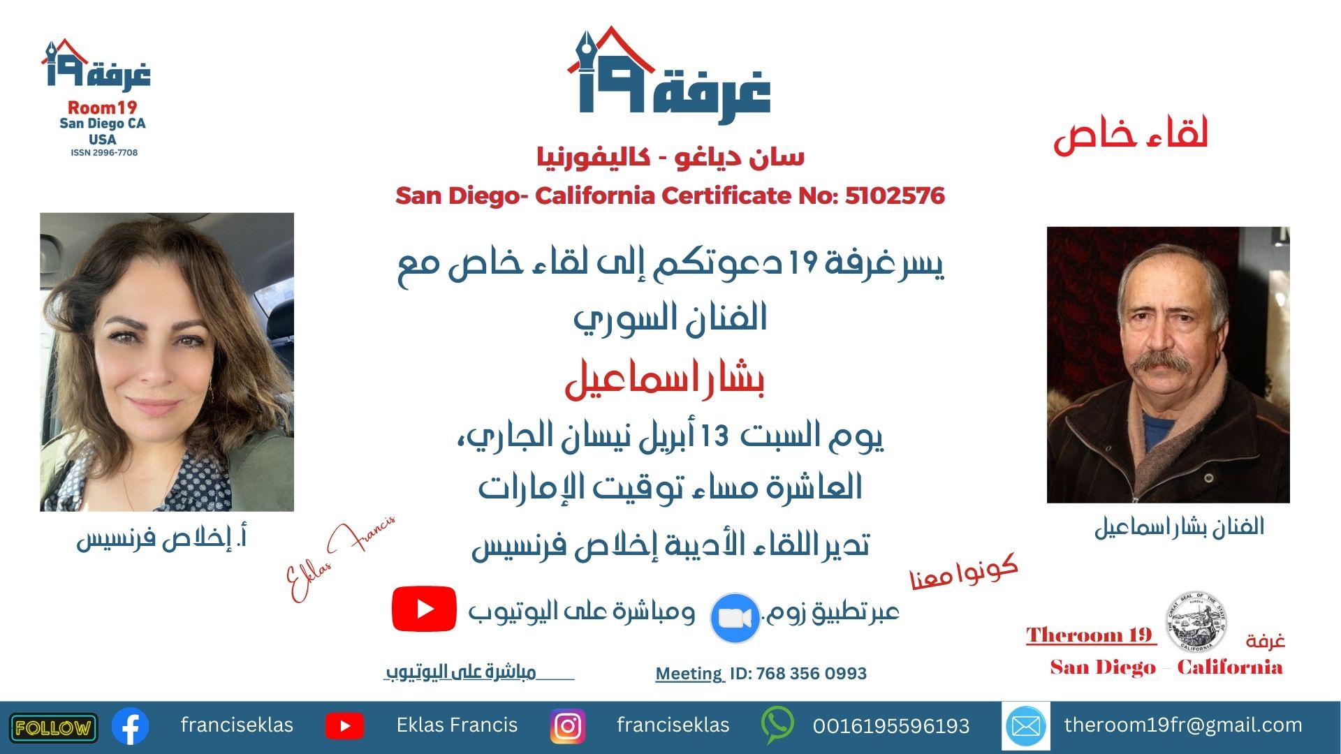 ندوات لقاء استثنائي من غرفة 19 مع الفنان السوري بشار اسماعيل المحرر 8 أبريل، 2024 يسر غرفة 19 دعوتكم إلى لقاء خاص واستثنائي مع الفنان السوري بشار اسماعيل يوم السبت 13 أبريل نيسان الجاري، الساعة 8 توقيت بيروت والقاهرة ، العاشرة مساء توقيت الإمارات تدير اللقاء الأديبة إخلاص فرنسيس تمنح شهادات حضور رابط الدخول https://us02web.zoom.us/j/7683560993?omn=82892539770 إخلاص فرنسيس Post navigation Previous: أنا مي زيادةـ لأوّل مرة عندما أكتب قراءة في كتاب، لا أعرف من أين أبدأ.Next: السّابع عشر من تشرين هذا التّاريخ! هو ذكرى تَبَلُّج ميخائيل نعيمة طفلًا على هذه “الأرض البديعة الكريمة الحنون” اترك تعليقاً إلغاء الردلن يتم نشر عنوان بريدك الإلكتروني. الحقول الإلزامية مشار إليها بـ *التعليق * الاسم * البريد الإلكتروني * الموقع الإلكتروني احفظ اسمي، بريدي الإلكتروني، والموقع الإلكتروني في هذا المتصفح لاستخدامها المرة المقبلة في تعليقي. مواضيع تهمك ندوات غرفة 19 تستضيف البروفيسور شربل داغر لقاء بعنوان: بين الكتابة والحياة المحرر 19 يناير، 2026 0 ندوات غرفة 19 تقدم هو الشعر بين الفصحى والمحكيّة مع الشاعر الاستاذ مارون الماحولي المحرر 12 يناير، 2026 0 ندوات غرفة 19 تقدم «الإعلام المسموع بين التثقيف،التسلية، وصناعة الوعي» مع الإعلامية الاستاذة ريتا نجيم الرومي المحرر 6 يناير، 2026 0